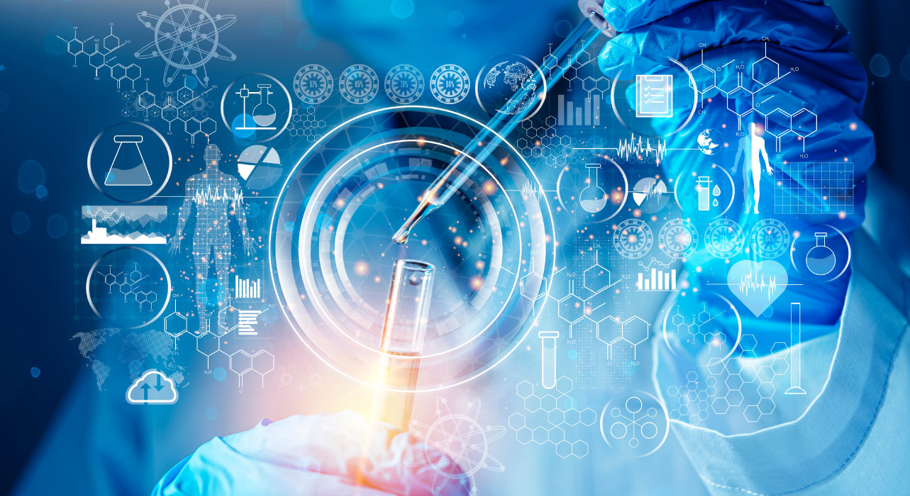 Hand adding liquid to a test tube, with digital graphics and icons related to healthcare and pharmaceuticals in the background.